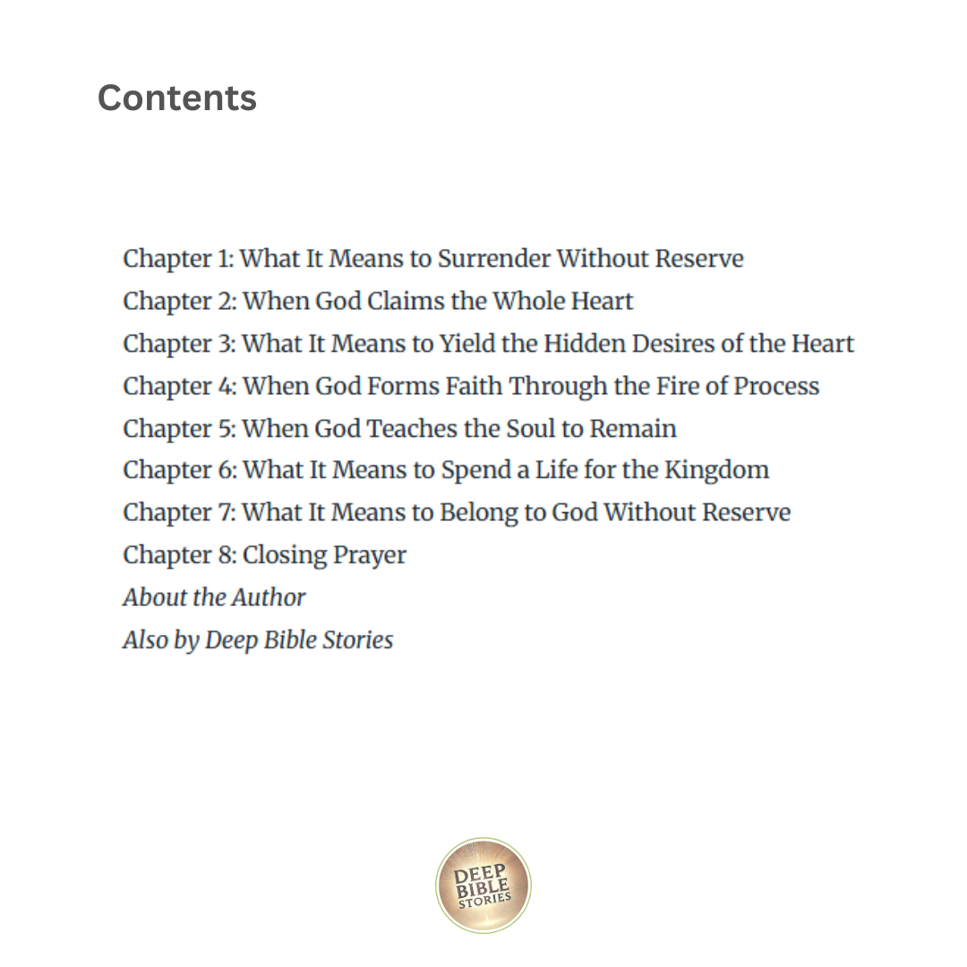 This powerful eBook was created to go hand-in-hand with our Deep Bible Stories video on Absolute Surrender. God doesn’t ask for part of your heart—He calls for all of it. This devotional unpacks what it means to lay everything down before the Lord, offering your plans, pride, pain, and preferences in exchange for His perfect will. Through Scripture, reflection, and bold application, you’ll be invited into deeper obedience and peace.