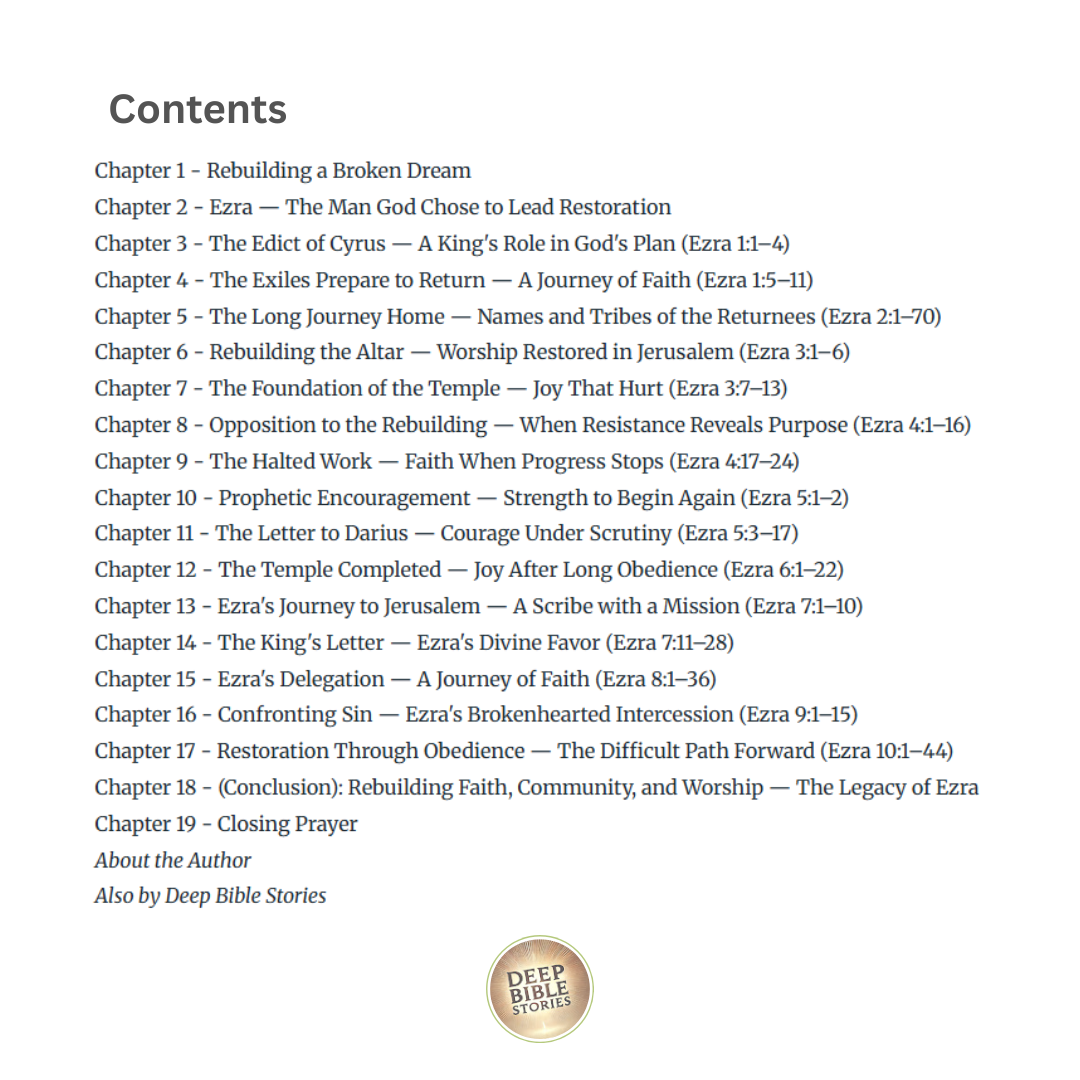 Rooted in our YouTube teaching script, this eBook follows Ezra’s journey of return and renewal with theological depth and heart-level application. Each chapter includes a key Scripture, contextual explanation, bolded life applications, and reflection questions. Whether you're rebuilding spiritually or leading others, this study will ground you in hope and truth.